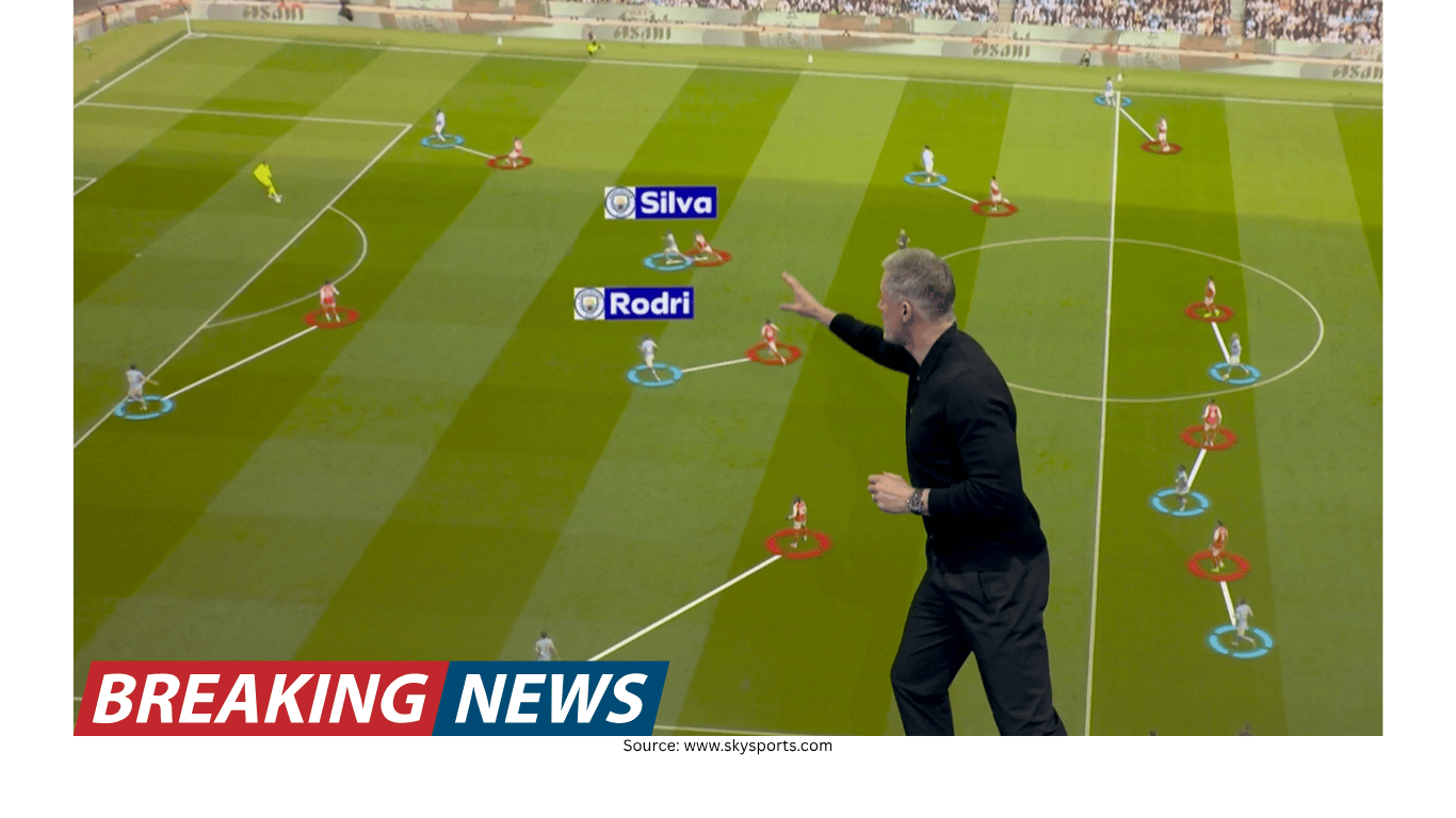 That detail matters because it describes the problem City faced at the start. Arsenal were not simply sitting in a block and reacting; they were actively hunting the ball high up the pitch. The early pattern, as Carragher described it, saw Arsenal’s midfielders stepping aggressively towards Rodri and Silva, limiting City’s ability to feed passes into more advanced areas.